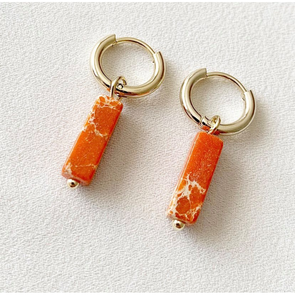 Aan de oorbel hangt een oranje steentje van ongeveer 2 centimeter.